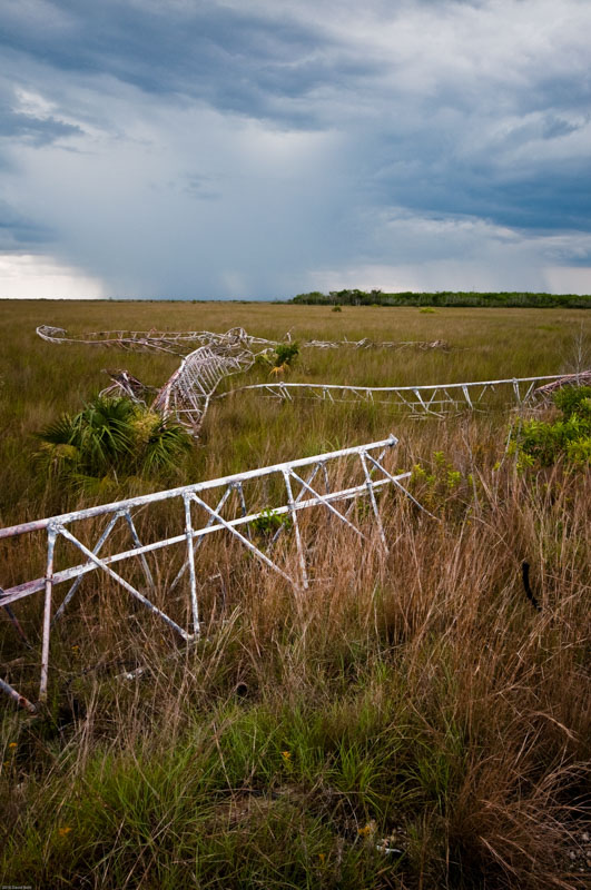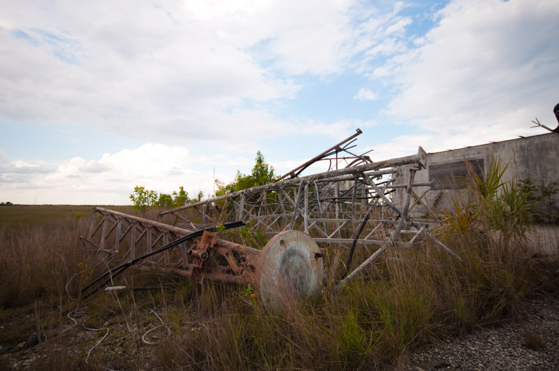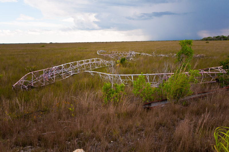 East Everglades Closures. The Tower Tract lies within #422. Access is via a single lane paved road east of SW 237th Ave. The road is currently gated. At the end of the road is the collapsing shell of a former building. There are walls but no roof. The area was once used to manage a large aerial tower that extended several hundred feet into the air. The tower was destroyed/damaged during Hurricane Andrew in 1992. Large sections of the tower, building and debris remain on the ground, posing a significant safety hazard.