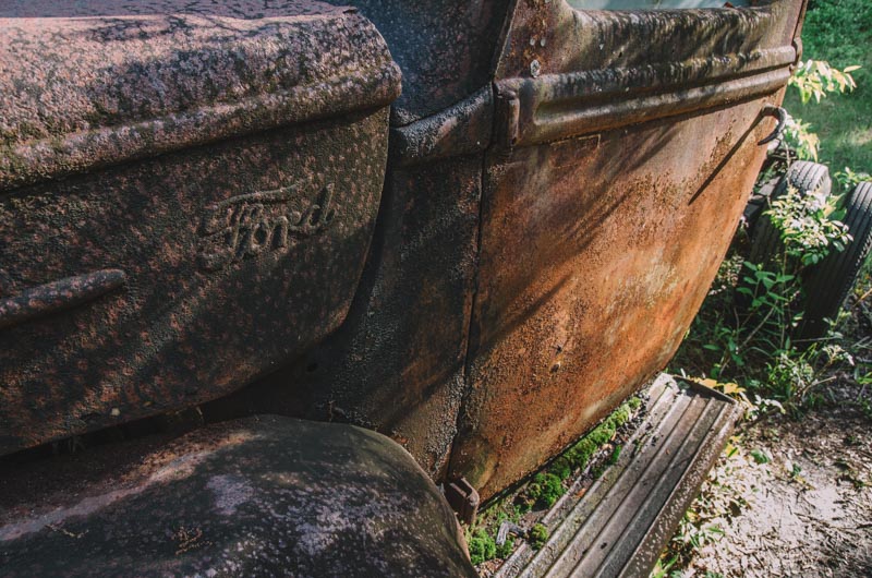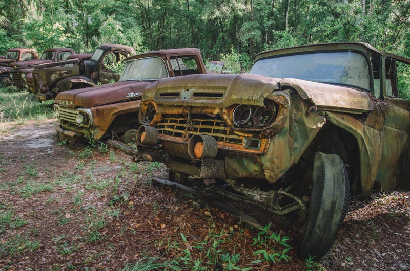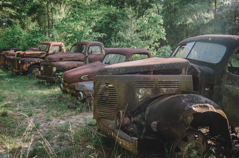 Just south of Crawfordville is a field containing rusted Ford cars and trucks overgrown with vines and grass, neatly lined up and in chronological order dating back to the early-1900s to the mid-1970s owned by Pat Harvey.