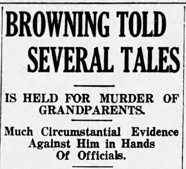 Josh Browning, George’s son, was apprehended and charged with their murders along with his friend John Tucker. According to Josh’s testimony, the two visited the home on the afternoon of May 9, 1918, and ate supper with the old couple before retiring to bed. It was a small one-room cabin furnished with two beds, a table, and three or four chairs.